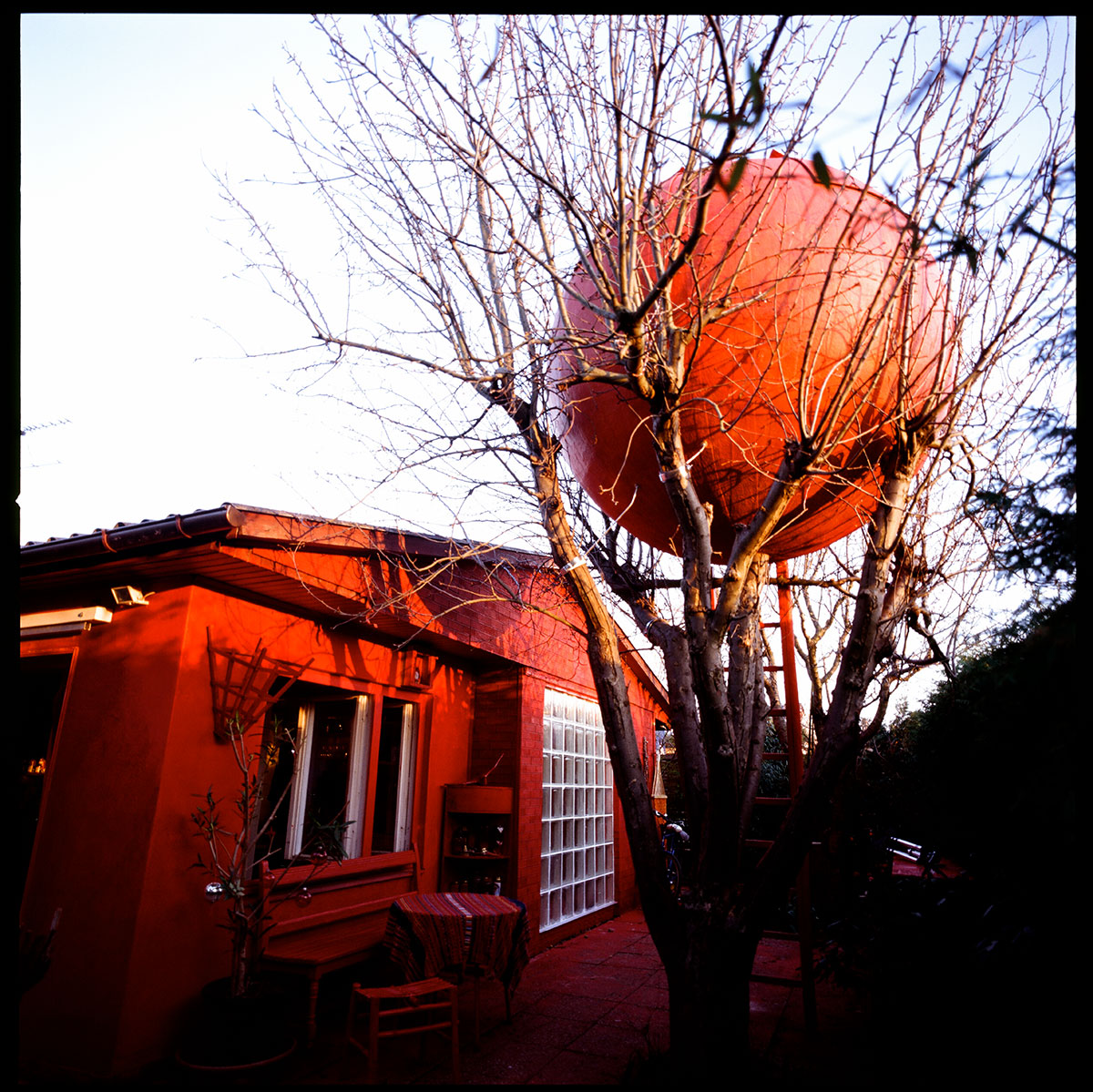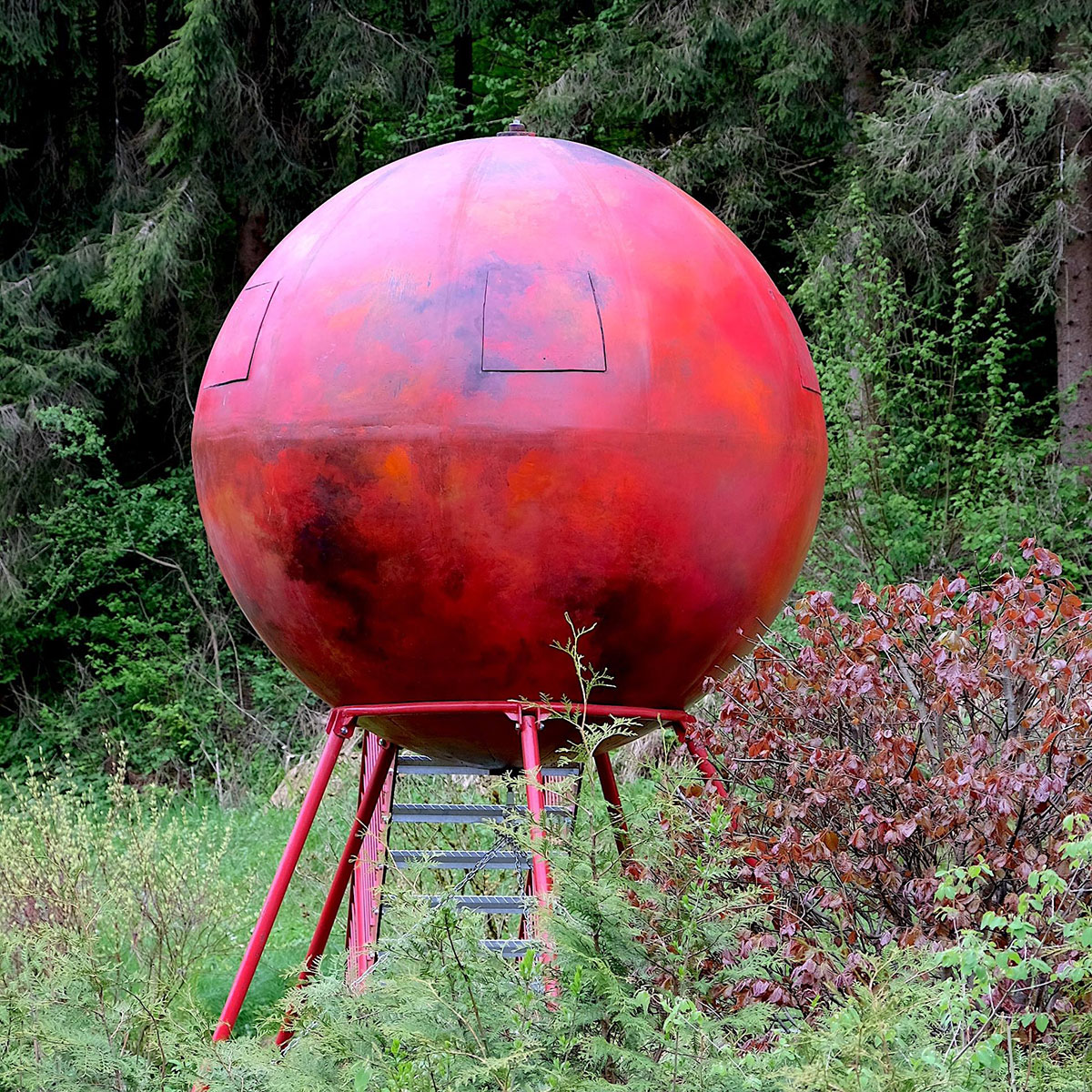Im „Ewigen Garten“ der Landesgartenschau Würzburg steht inmitten von roten Pflanzen das kugelförmige rote Tiny House / Baumhaus mit dem Titel “Scandal in Paradise“, einem zentralen Motiv von ONA B., die ihre Wirklichkeit nach Träumen und Phantasien modelliert. Kunst und Leben fließen ineinander und der “Ewige Garten“ wird zum Paradies in dem sich schillernde Räume der Imagination ausbreiten können. 2009 für einen alten Apfelbaum entworfen, dessen fünf starke Äste die Kugel wie eine Hand umschlossen hielten,