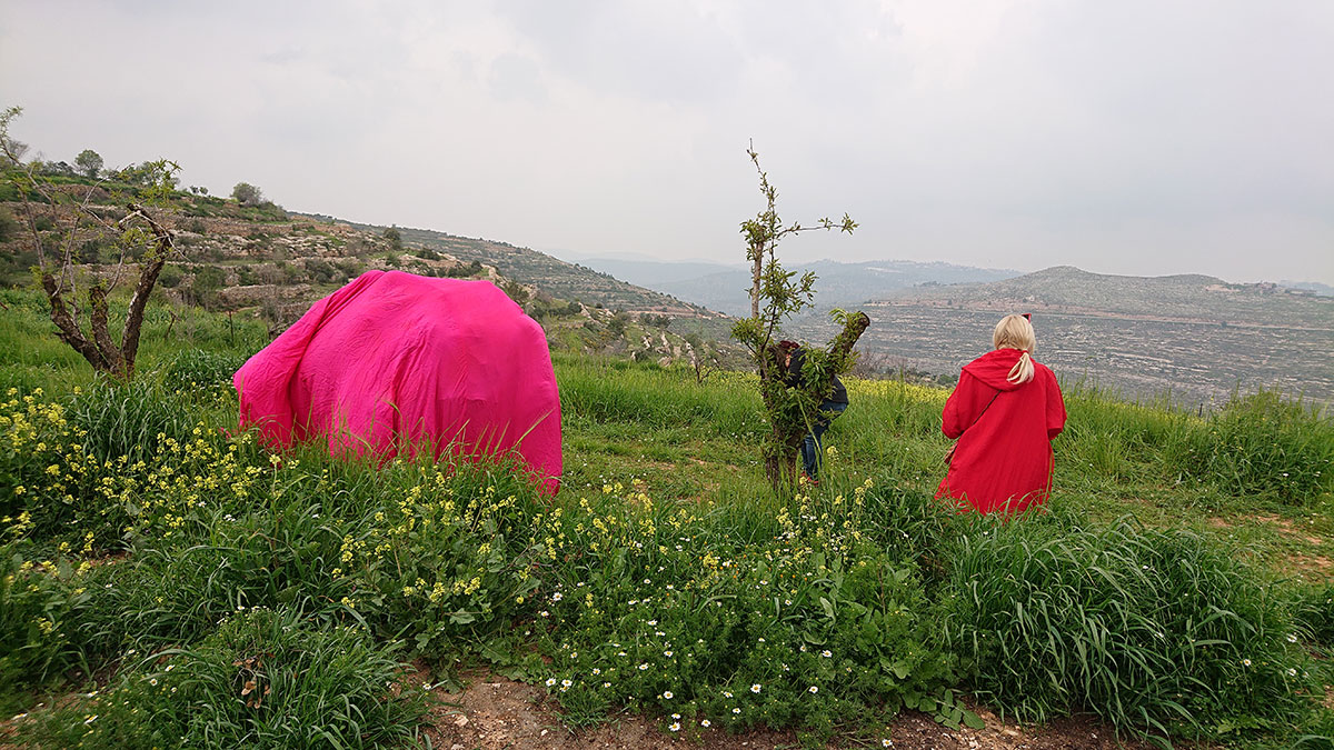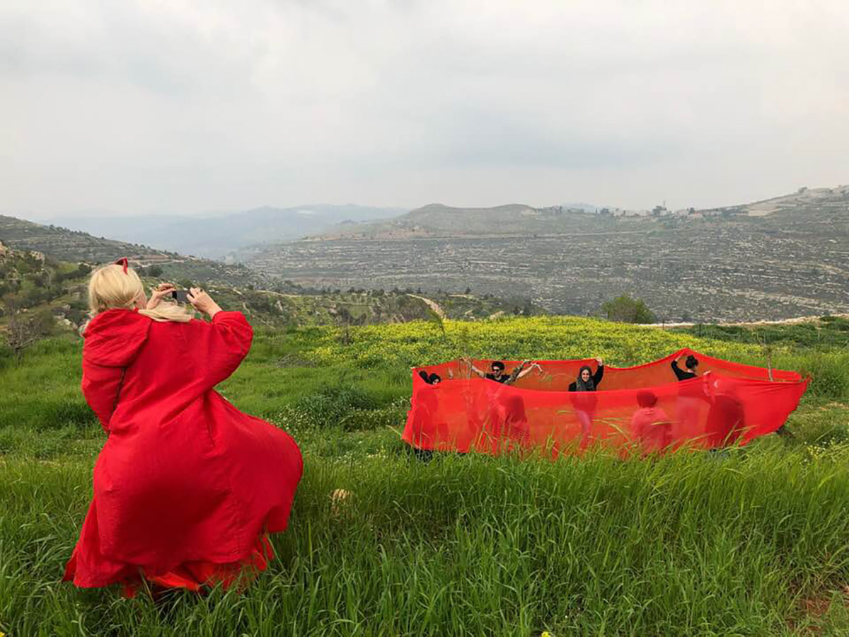 im Rahmen der Ausstellung „Art for Peace” an der Dar Al-Kalima University Gallery, Betlehem in Palästina hielt ONA B. im Sommersemester ein Seminar und realisierte dort mit Student*innen eine Land Art Performance / Fotos: ONA B.