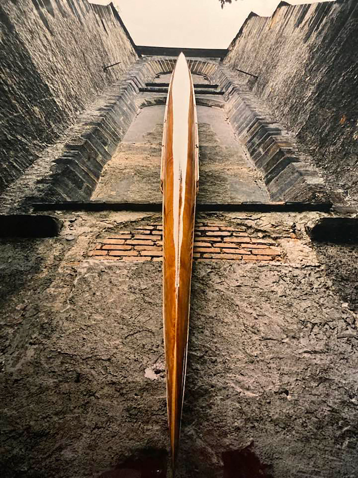 Die permanente Installation des 8-er Rennruderbootes an der östlichen Außenmauer der Minoriten-kirche Krems / Stein (restauriert 2024) ist eine poetische Metapher zur Transformation und oszilliert zwischen dem Fährmann Charon aus der griechischen und der Himmelfahrt aus der christlichen Mythologie.