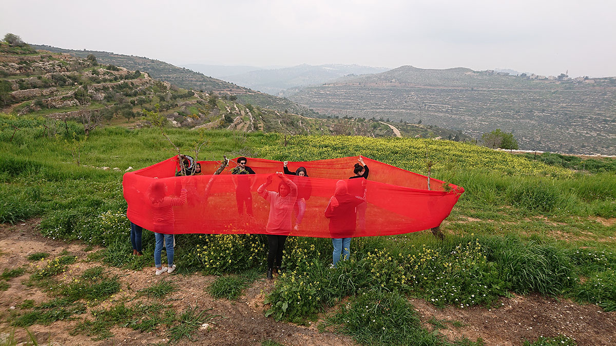 im Rahmen der Ausstellung „Art for Peace” an der Dar Al-Kalima University Gallery, Betlehem in Palästina hielt ONA B. im Sommersemester ein Seminar und realisierte dort mit Student*innen eine Land Art Performance / Fotos: ONA B.